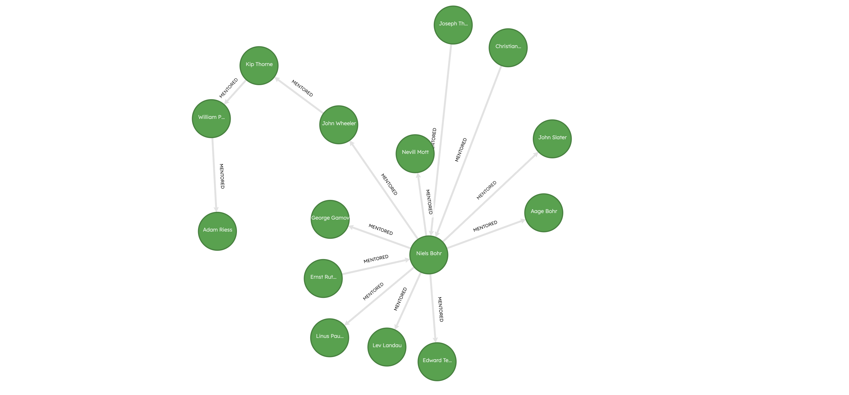 Adam Riess, who has the highest PageRank score, has notable academic ancestors such as Kip Thorne, John Wheeler, Niels Bohr, going all the way back to Ernest Rutherford and J.J. Thomson! The high PageRank score for Adam Riess can be attributed to his presence in a part of the network that has many other influential scholars, such as Niels Bohr, Ernest Rutherford, J.J. Thomson, Edward Teller, and Linus Pauling.