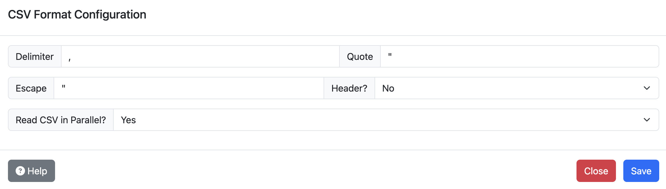 CSV import options can be specified, such as custom quote characters, escape characters, delimiters, etc. To do this, expand the table’s options and click on “Configure CSV format”. The options are identical to those available in the CSV import section of the documentation.