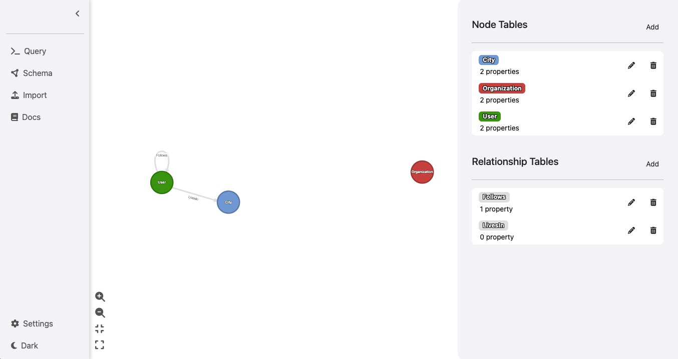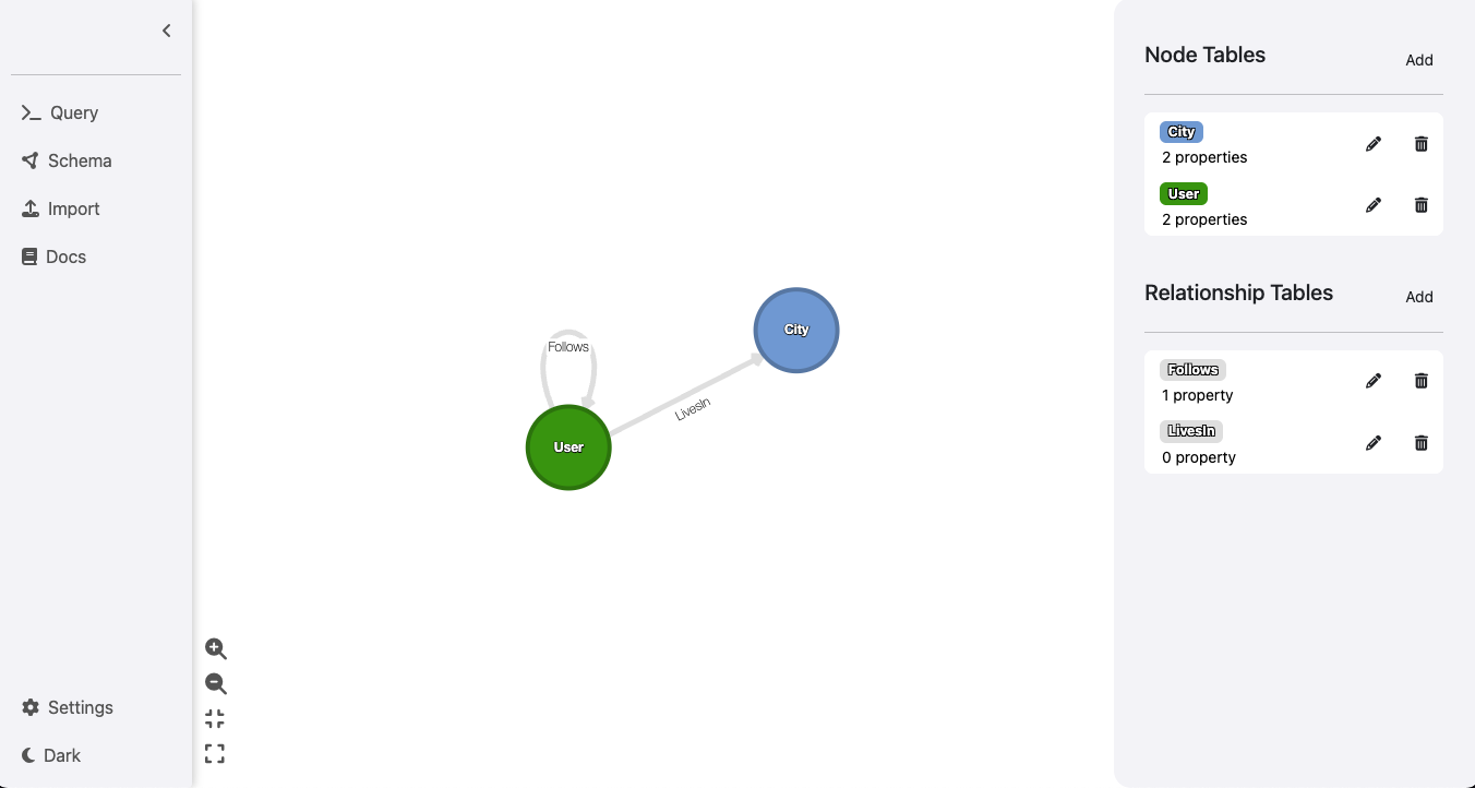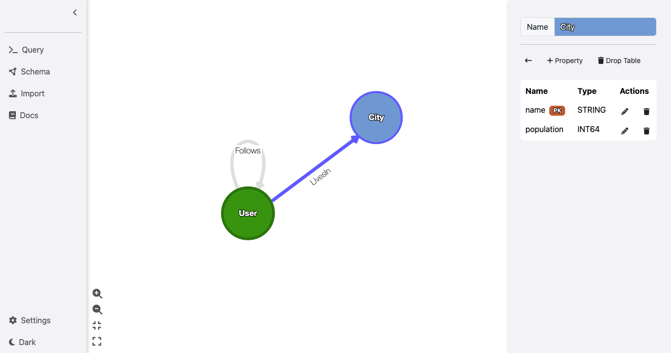 You can also edit the schema of your existing tables, specifically add or remove properties from them as follows. When you click on a node or relationship in the graph view or the edit icon next to a table, the properties of the corresponding table are shown in the right panel as shown below. This panel contains buttons to add/remove/rename properties of an existing table. There is also a Drop Table button to drop the entire table.